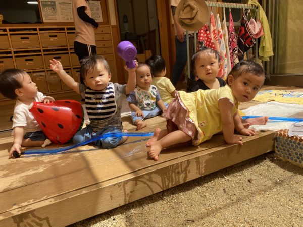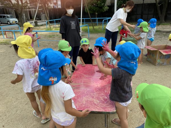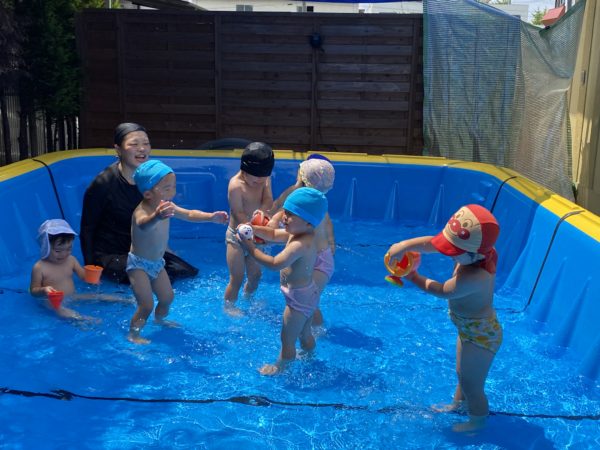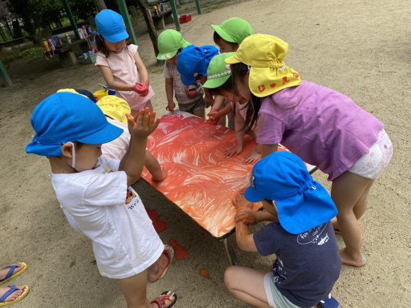 夏の楽しみ できごと 2021.07.14 ボディペインティング ヌルヌルの感触を楽しんだり 指でお絵描きしたり 夏ならではの遊びデス ボディペインティング 水あそび 小さなお友達も ウッドデッキで ミストのように出てくる水を浴びて 涼を感じています プールあそび 何と言っても楽しい夏の遊びは プールです。 夏野菜も大きく育っています。雨で収穫出来ずにいたキューリが 太ーくなっていました。今年は、枝豆もたくさん実をつけてくれましたよ。