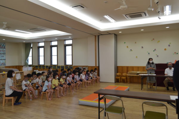 園長先生のお礼の挨拶の後にはひまわりぐみ(5歳児)からもお礼をさせていただきました。慣れない雰囲気に緊張もしていた様ですが、園を代表して大役を果たしてくれました。ありがとう!