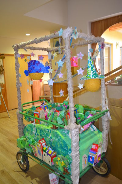 おみこしのテーマは「おつきさま」です。それぞれのクラスで作ったものを飾り付けてもらいました。