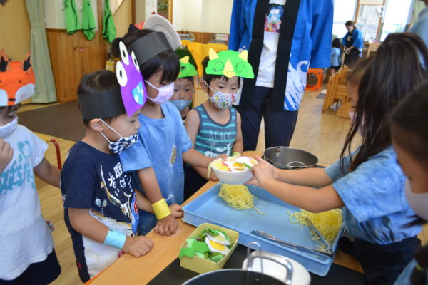 お寿司屋さんがオープンしました。お客さん達は自分で作ったお面をつけてお店をまわりました。