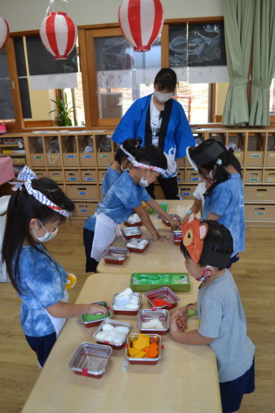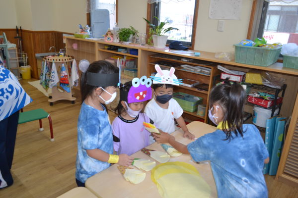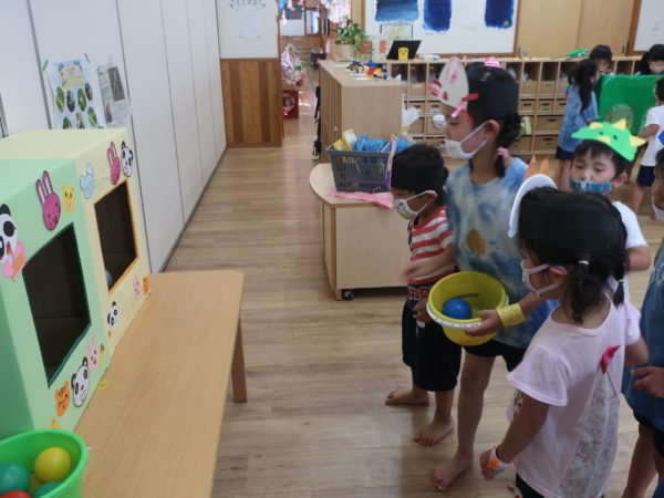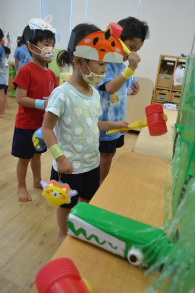 毎年、保護者の方にも参加していただき盛大に行っていた夏まつりですが昨年同様、保育の中でのおまつりごっことなりました。