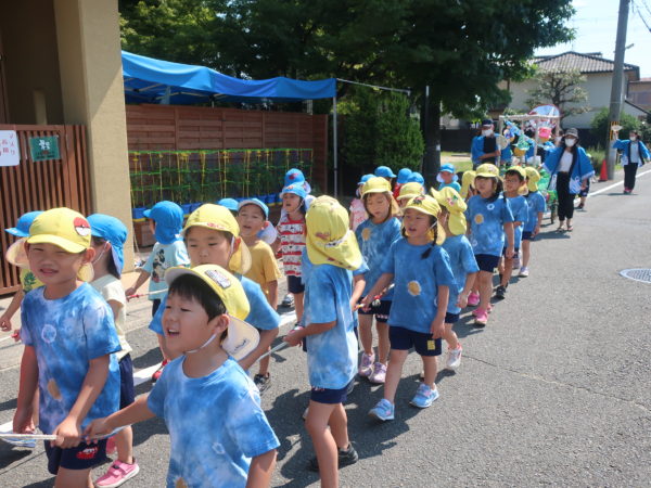 まず初めにみこし練りです。ひまわりぐみ(5歳児)は自分たちで染めて作ったお揃いのTシャツを着てのお祭りとなりました。