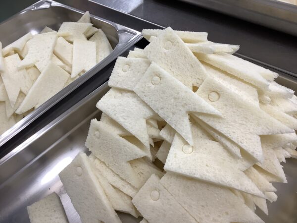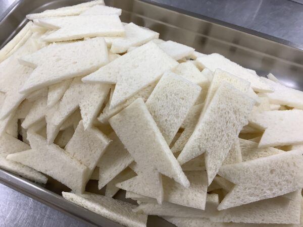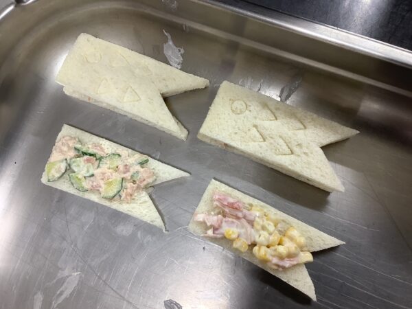 5月 お誕生会献立!! 給食室より 2023.05.15 今月は『こいのぼりランチ』です。サンドイッチでこいのぼりを作りました。 サンドイッチ用の食パンをこいのぼり型にカットして・・・ 目の型をつけて・・・ ウロコの型をつけて・・・ 具を挟んだら・・・ こいのぼりのサンドイッチのできあがりです!!具材は「ツナ&きゅうり」と「ハム&コーン」の2種類を作りました。 カットした三角の部分はおかわりにしました。年長さんのお部屋にいくとおかわり用に三角のミニサンドを作ってくれていて、とても喜んでくれていました。