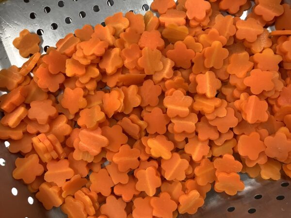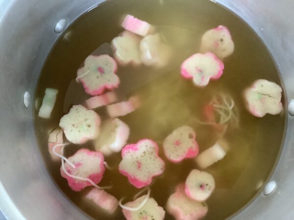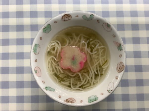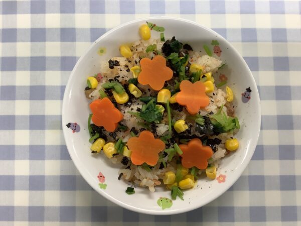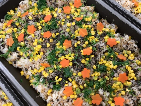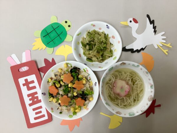 11月のお楽しみメニュー!! 給食室より 2024.11.09 今月は『七五三のお祝い』として、「鮭のちらし寿司」を作りました。 鮭をメインに、具材を混ぜ込んでトッピングは4種類のせました。人参は花形に抜いて華やかさを出しました。 鮭フレーク混ぜ込む具のりコーン三つ葉人参 すまし汁にもお花の麩を入れました。 お花も喜んでくれて「おいし~!!」といっぱい食べてくれました。