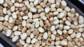 今月はひな祭りがあります。なので3日のおやつにひなあられのような感じでお麩を使って『おひなさまラスク』を作りました。