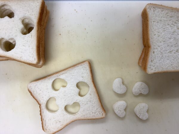 2月お誕生会献立!! 給食室より 2023.02.21 今月のお誕生会は2月14日バレンタイデー♡だったので、『ハートランチ』にしました!! パンをハートに型抜きして・・・ サラダとハムを挟んだら・・・ ハートの窓からピンクのハムが見えてカワイイ♡サンドイッチができました!! 抜いたハートのパンは・・・ こんがり焼いてクルトンに!! 人参もハートに抜きました!! ハートいっぱいのシチューができました!! ハートいっぱいの給食で子どもたちが、笑顔いっぱいになってくれたらと思います♡