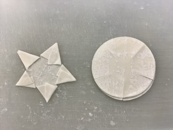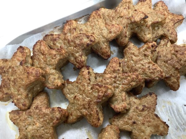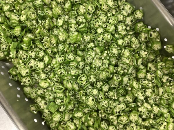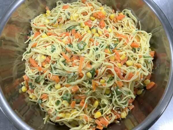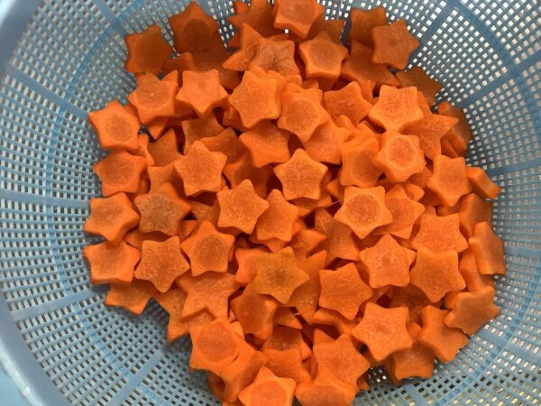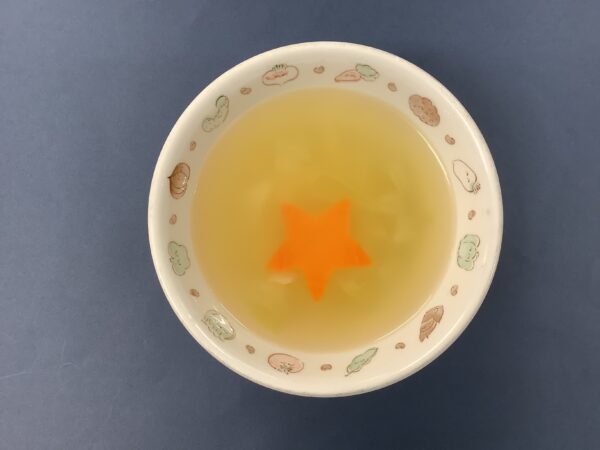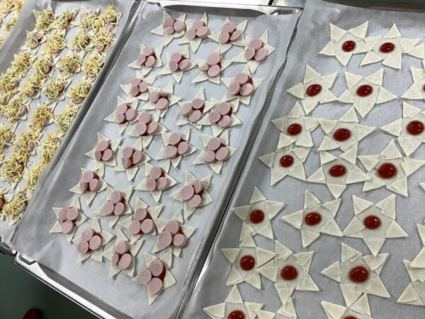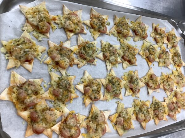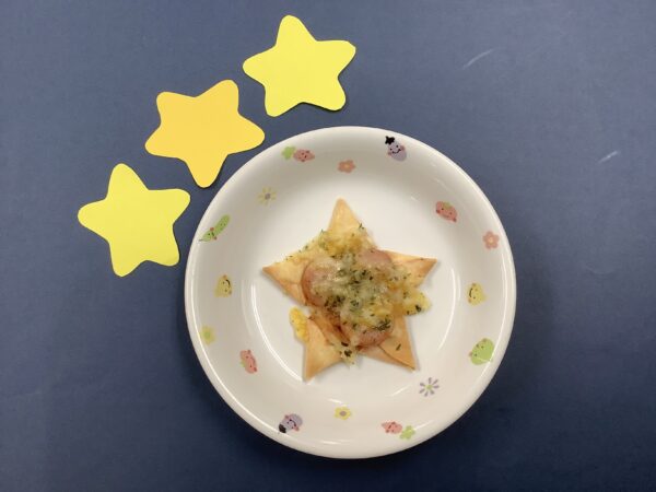 7月のお楽しみメニュー!! 給食室より 2025.07.09 今月は『七夕』をテーマに給食とおやつと両方で星がイッパイの献立にしました。 給食には・・・ 星型のハンバーグを使い オクラを星に見立てたサラダを添えました。 スープには星型の人参を入れました。 全部盛り付けたら、お星さまイッパイの給食が出来上がりました!! おやつには・・・ 餃子の皮を使い星型のピザを作りました。 餃子の皮を切って、折って、星型を作りました。 ソースと具材をのせて焼き、サクサクの星型ピザのできあがり!! お部屋から、キラキラ星の歌が聞こえたりして、とても喜んでくれました。