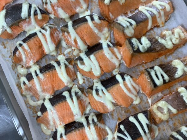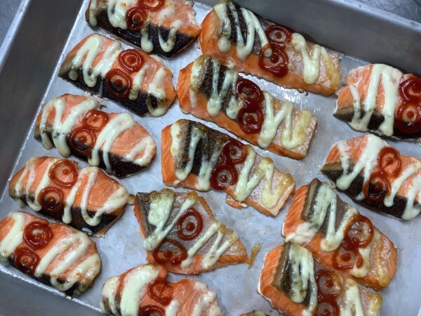 鮭にマヨドレとケチャップで絵を描いて「ミイラ」に