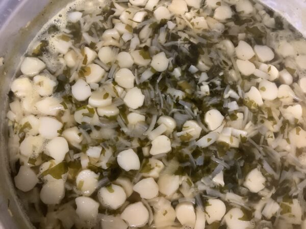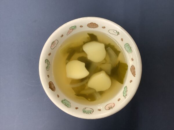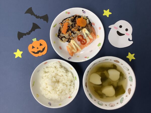 給食では、「鮭のオーロラ焼き」・「ひじきサラダ」・「すまし汁」をハロウィン風にアレンジしました。