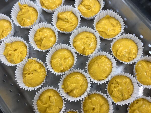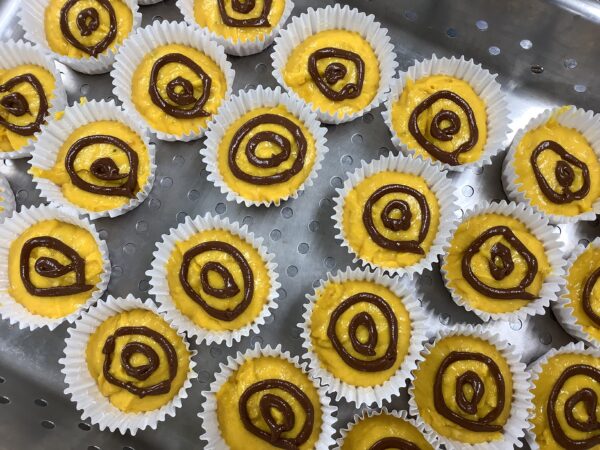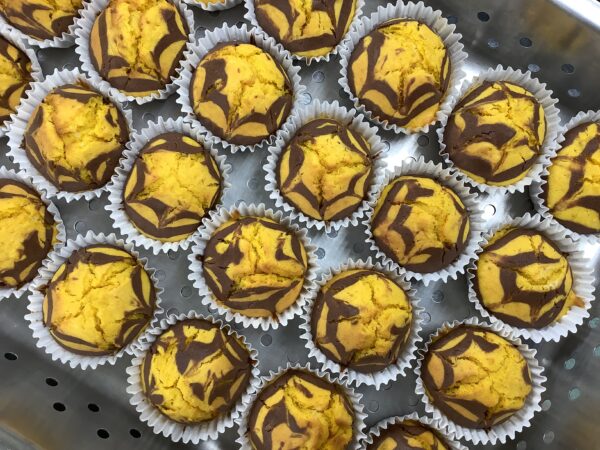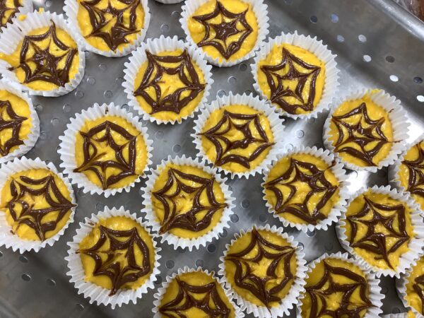 2色の生地を作って模様を描いて焼きました。美味しそうに膨らんでくれて嬉しいような、ちょっと絵が消えてしまって悲しいような・・・。でも、クモの巣と分かってもらえたので良かったです!!