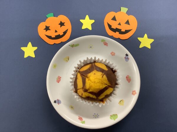 おやつでは、「南瓜ケーキ」を作りました。クモの巣みたいな模様をつけてみました。